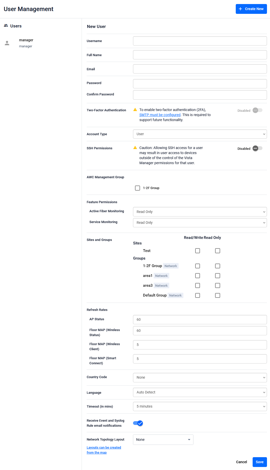 Timeout is set to 5 minutes by default. - Select whether to use the Receive Event and Syslog Rule email notifications, and if desired, select the default Network Topology Layout to be assigned to this user.