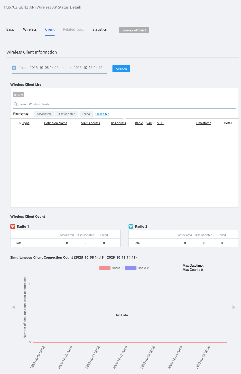 | Specified period | Specify the start and end date and time of the period in the wireless client's history to be displayed, either by calendar control or by manually entering the date and time. Specify the period and click the "Search" button to reflect it in the list. By default, the clients detected within the last 7 days prior to the screen display are shown. |