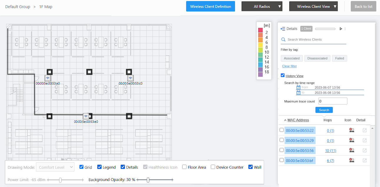 - The MAC and IP addresses of all the associated/disassociated/failed clients on the map will be shown in the client list at the right side of the Content section.