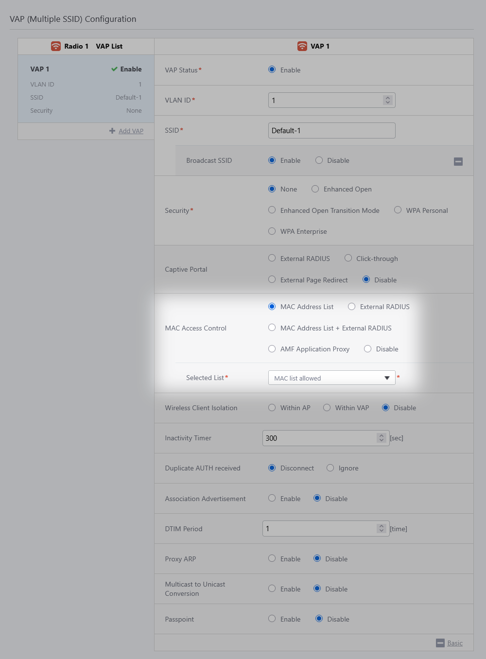 In these models, you cannot use separate MAC Address Lists for VAPs configured on a single AP Profile.The same MAC address list is applied to all VAPs for which "MAC Address List" is selected as the MAC Access Control method in the "VAP (Multiple SSID) Configuration".