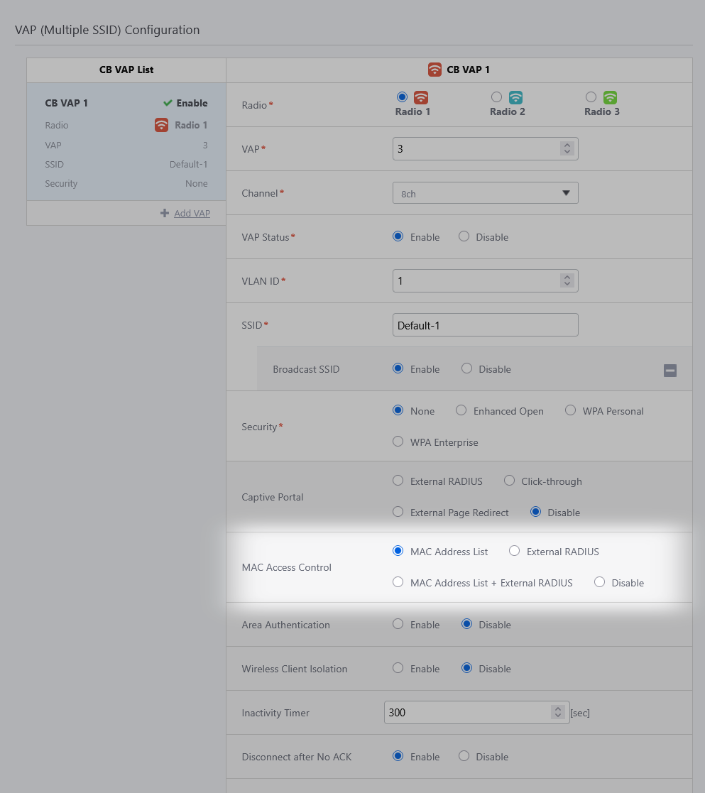- In the "VAP (Multiple SSID) Configuration" section, select "MAC Address List" for each VAP on which you want to use MAC Access Control using the list.
