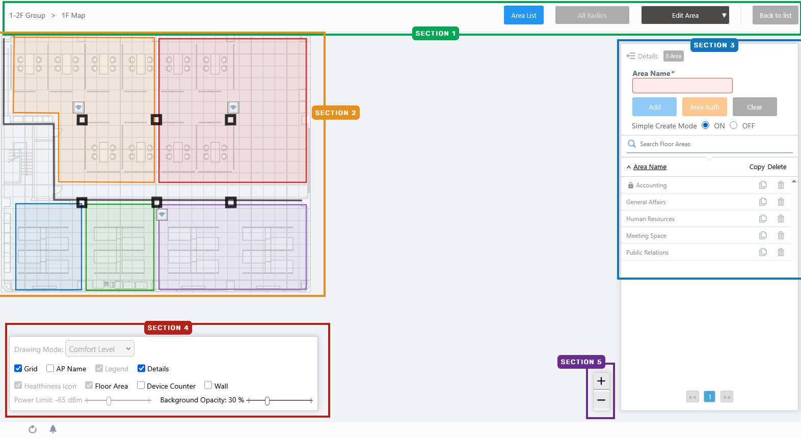 | Device Counter | On the top left of an area, indicates the number of registered APs that are arranged in the area. |