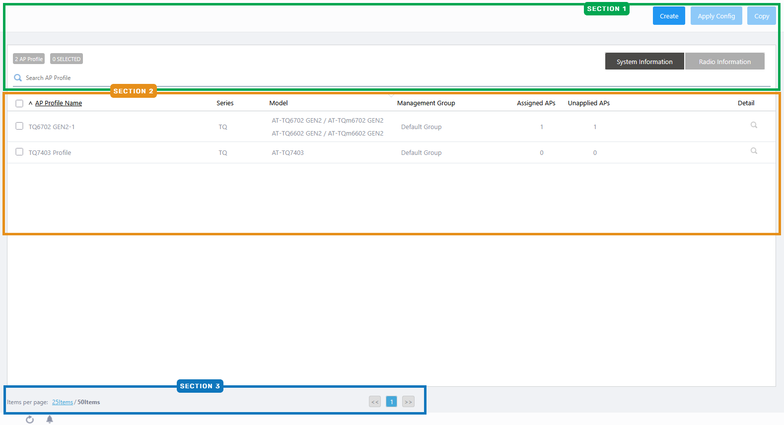 | Details (magnifying glass icon) | Shows the AP Profile details page. Refer to Operation Reference > Wireless Configuration > Change Management Group or AP Profile for AP for more details. |