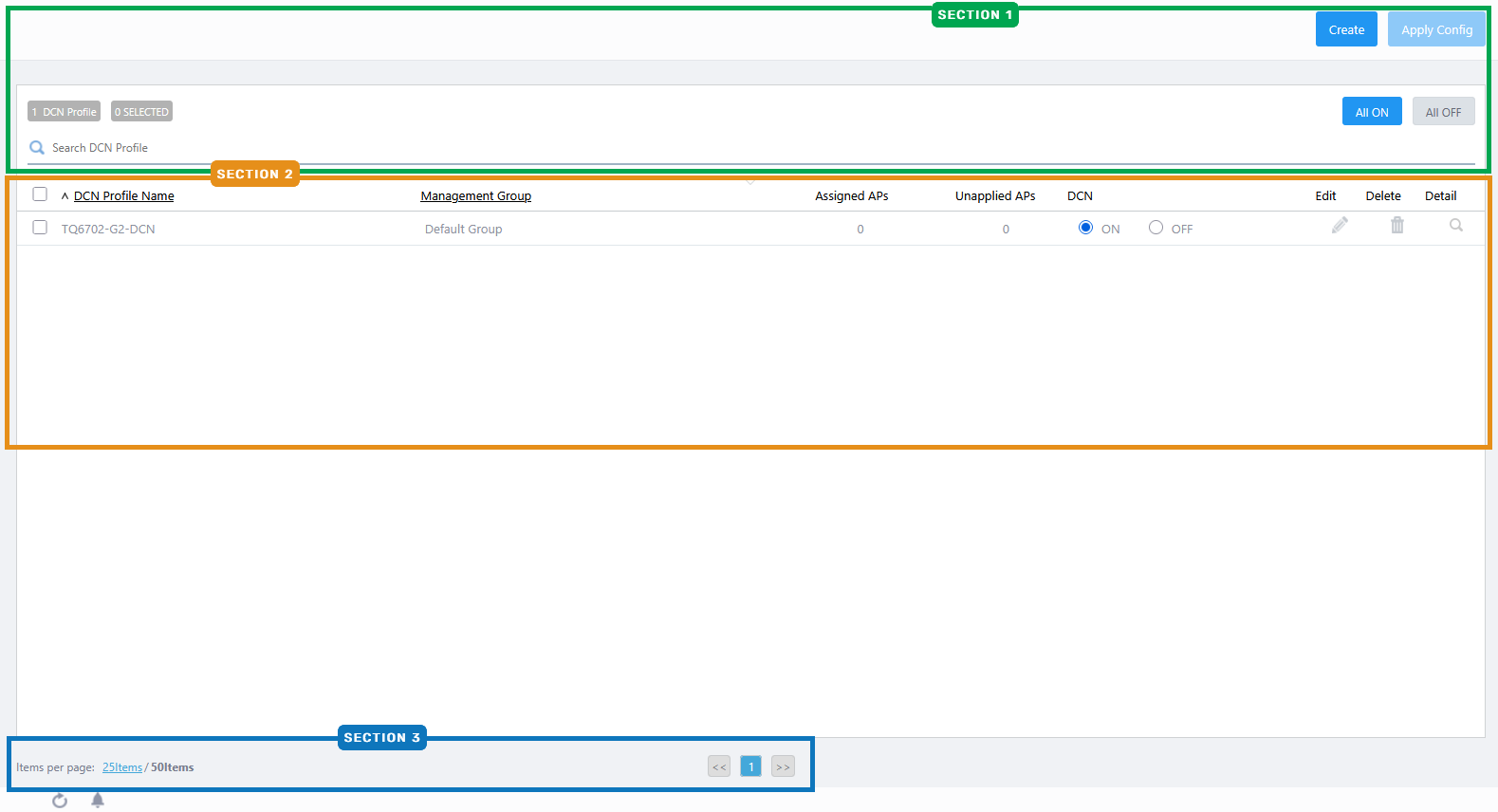 | All ON/All OFF buttons | Turn all DCN profiles ON or OFF. To apply the changes, you must tick the checkbox for the target DCN profile and then "Apply Config". |