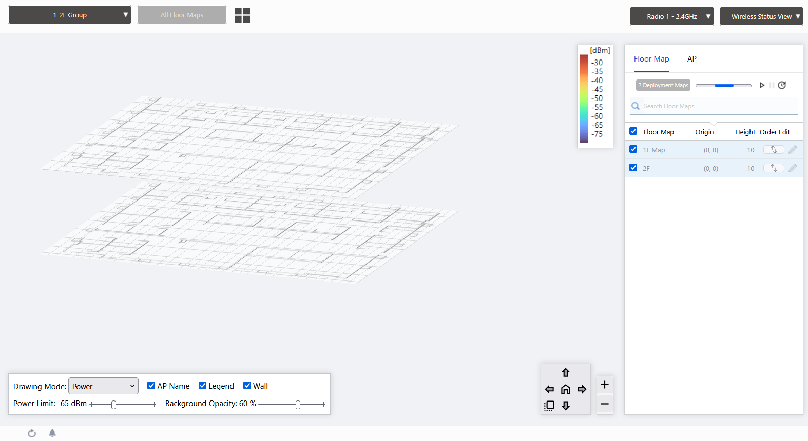 | Wall | Lets you choose whether to display the walls if walls have been created on the floor map (using the Edit Wall page). Check to display.NoteIf walls have been defined, attenuation by the walls takes effect over the heat map even if this control is left unchecked. |