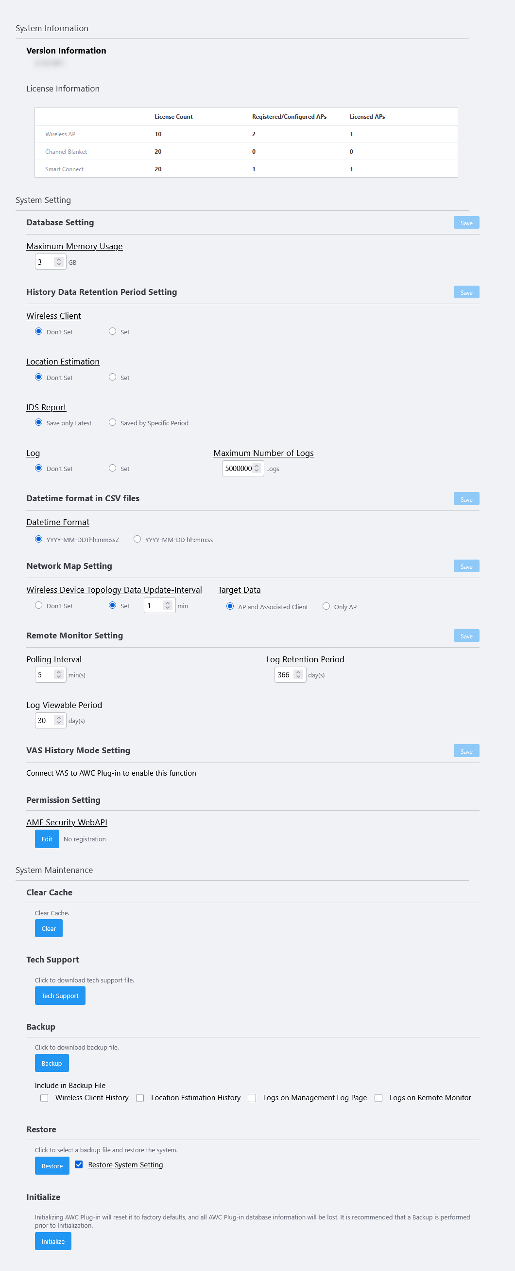 The System Setting page lets you see the AWC Plug-in version, factory-reset the plug-in, and configure system settings.
