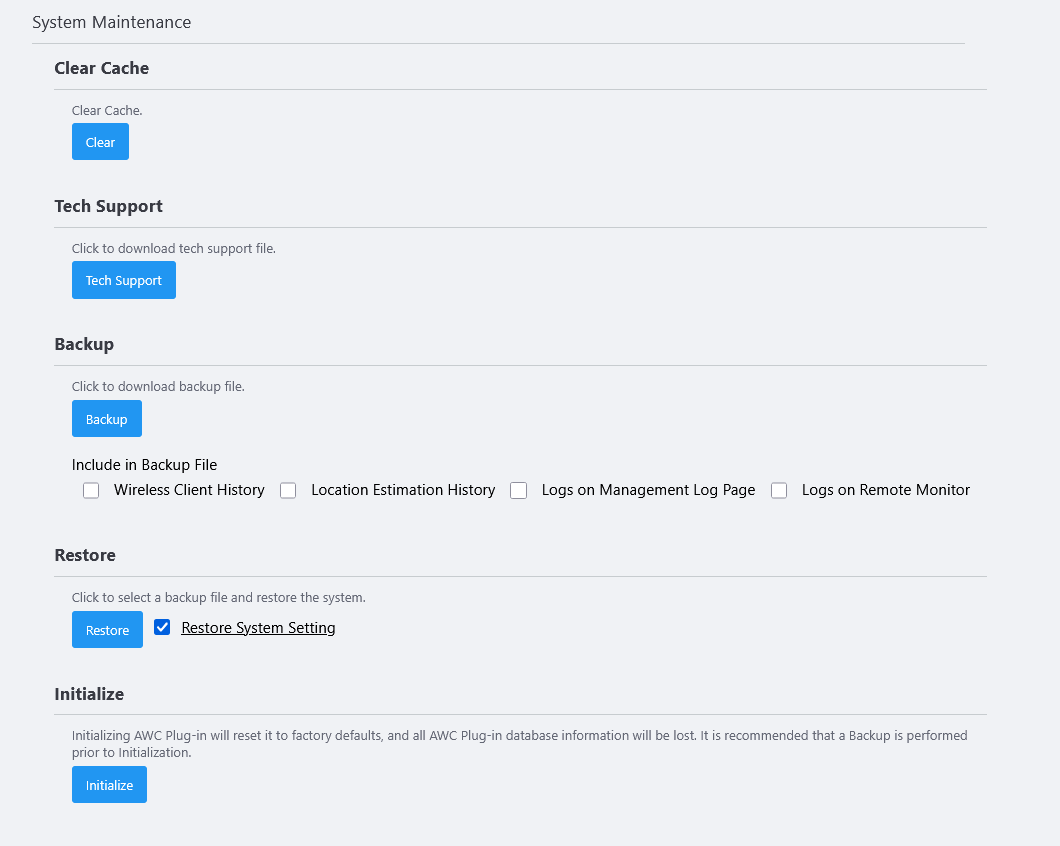 | Restore System Setting | If checked, system settings are restored from a backup file, together with management information such as APs and floor maps. By default, this option is not checked. System Configuration includes the following: