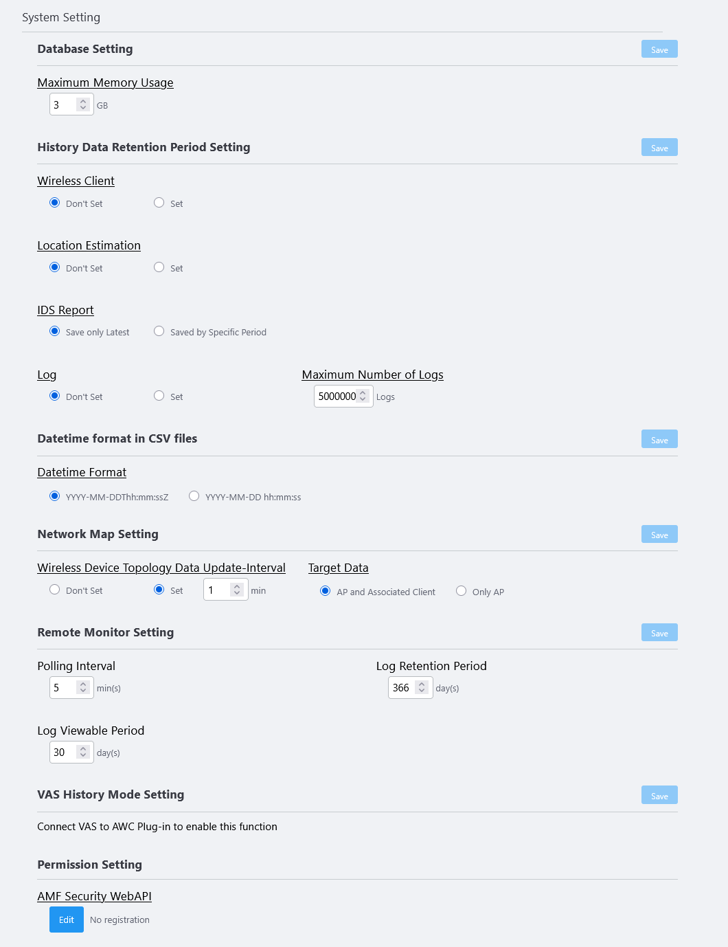 | Client Location Estimation | Specify a retention period for location estimation histories of wireless clients and APs that are displayed on the Wireless Monitoring > Floor Map screen.