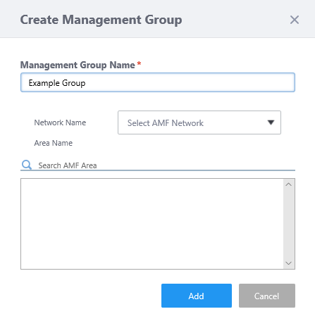 Item Name Description Management Group Enter a name for the Management Group. Max 100 characters (mandatory). Network Name Select an AMF Network to manage. Area Name Select AMF areas from the list.