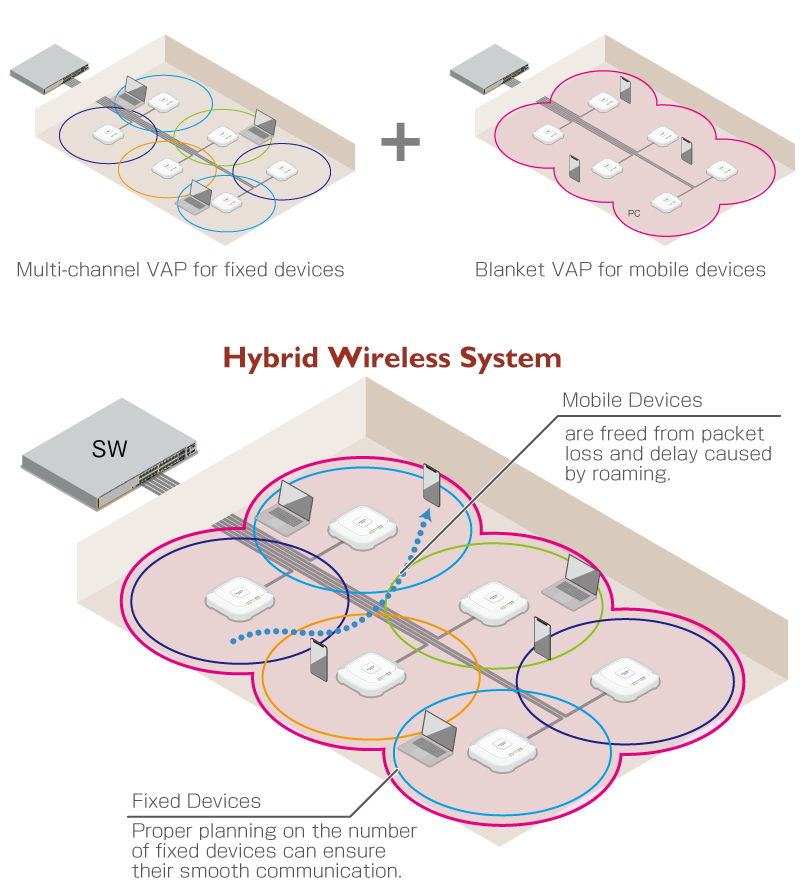 With AWC-CB, it is possible to easily build a hybrid wireless network, which combines the strengths of both multi-channel and blanket networks. Multi-channel and blanket networks can be configured on a single AP, where the multi-channel networks are defined as ordinary VAPs in an AP Profile and the blanket networks are defined as VAPs in a CB Profile.