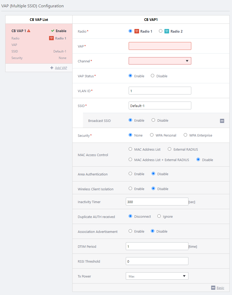 - Configure items in the "Profile Configuration" and "VAP (Multiple SSID) Configuration" sections as required.