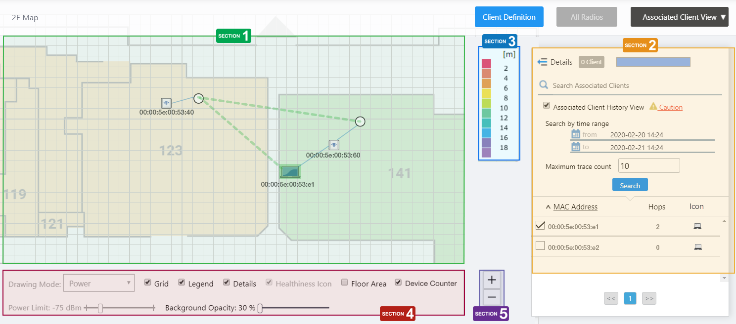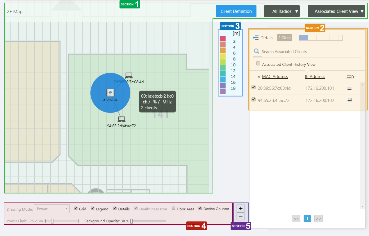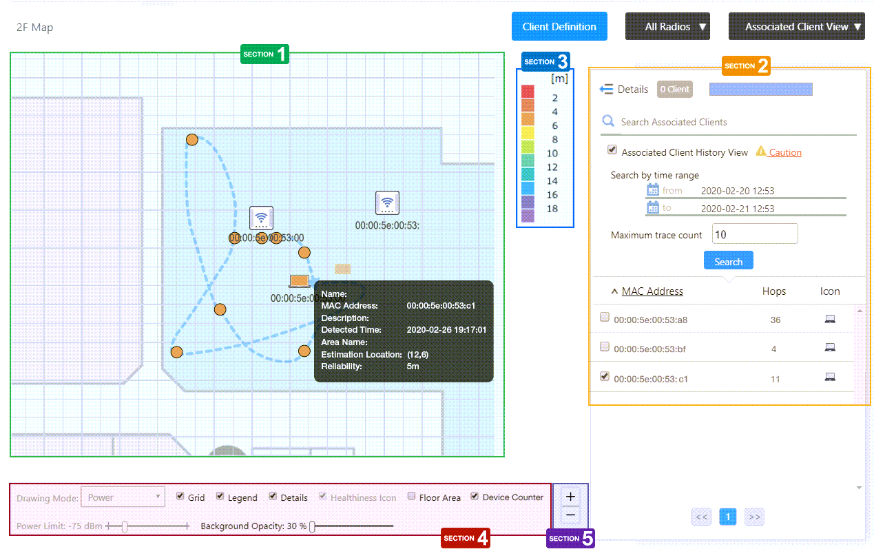 You can draw areas (rooms, etc.) with planar polygons, and name these areas such as "Meeting Room", "Lounge", and "Auditorium" on the floor map.The defined areas will be displayed in each View of the floor map, and also shown in the Location Estimation popup information in the Associated Client View.