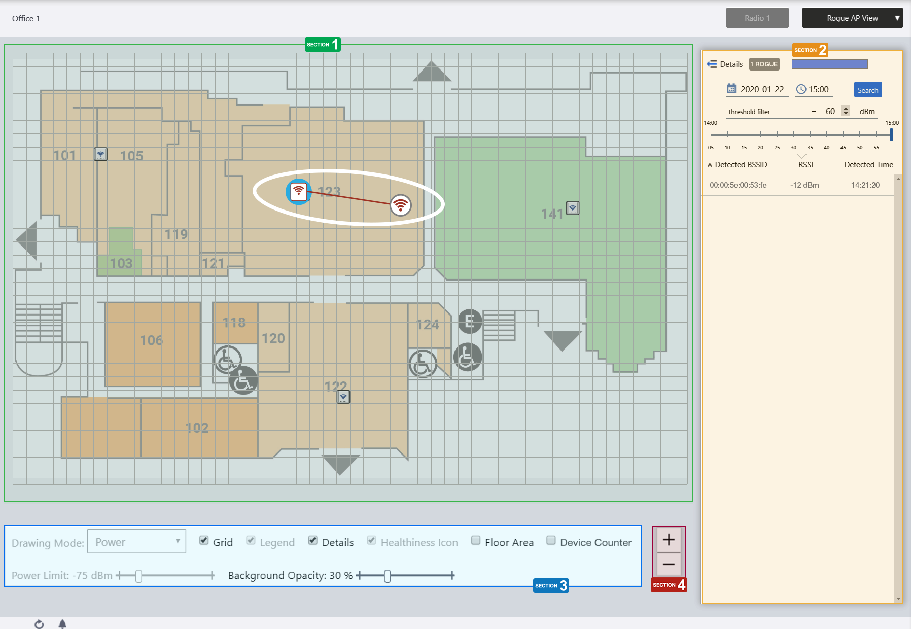 - When you click a rogue AP icon on the floor map, the corresponding entry in section 2 is highlighted.