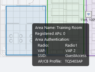 When the area authentications is configured on this area, displays the radio band, VAP name, SSID, and AP/CB Profile applied to the area.