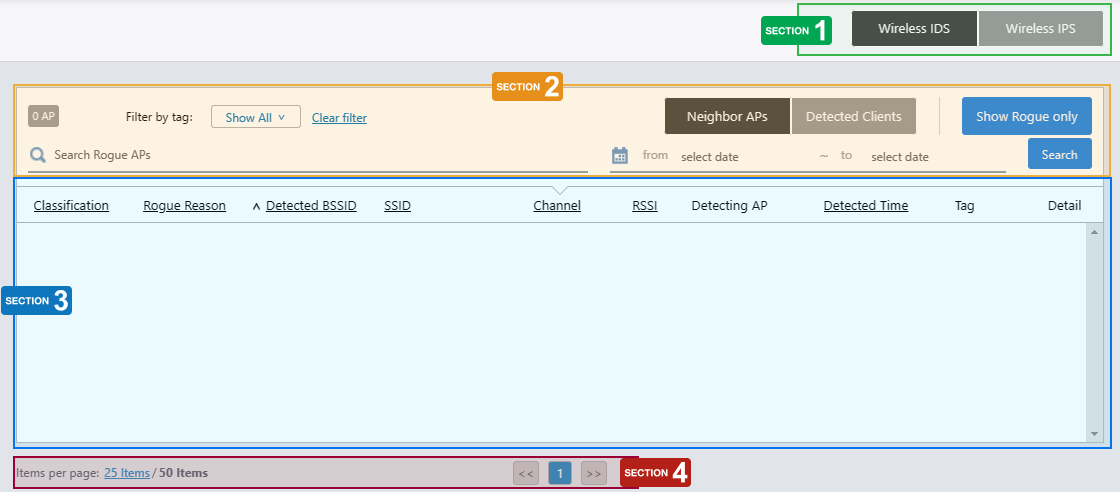 Shows the list of detected neighbor APs. The list's contents depend on the "IDS Report History" configuration in the "Data Retention Period Configuration" section of the System Setting page.