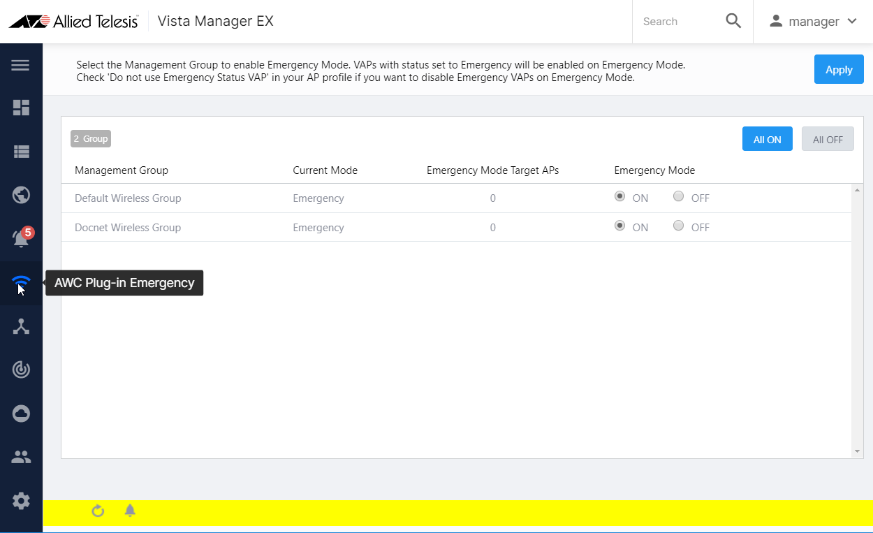 | "Apply" button | Lets you apply Emergency Mode status (ON/OFF) to APs in the Management Group. |