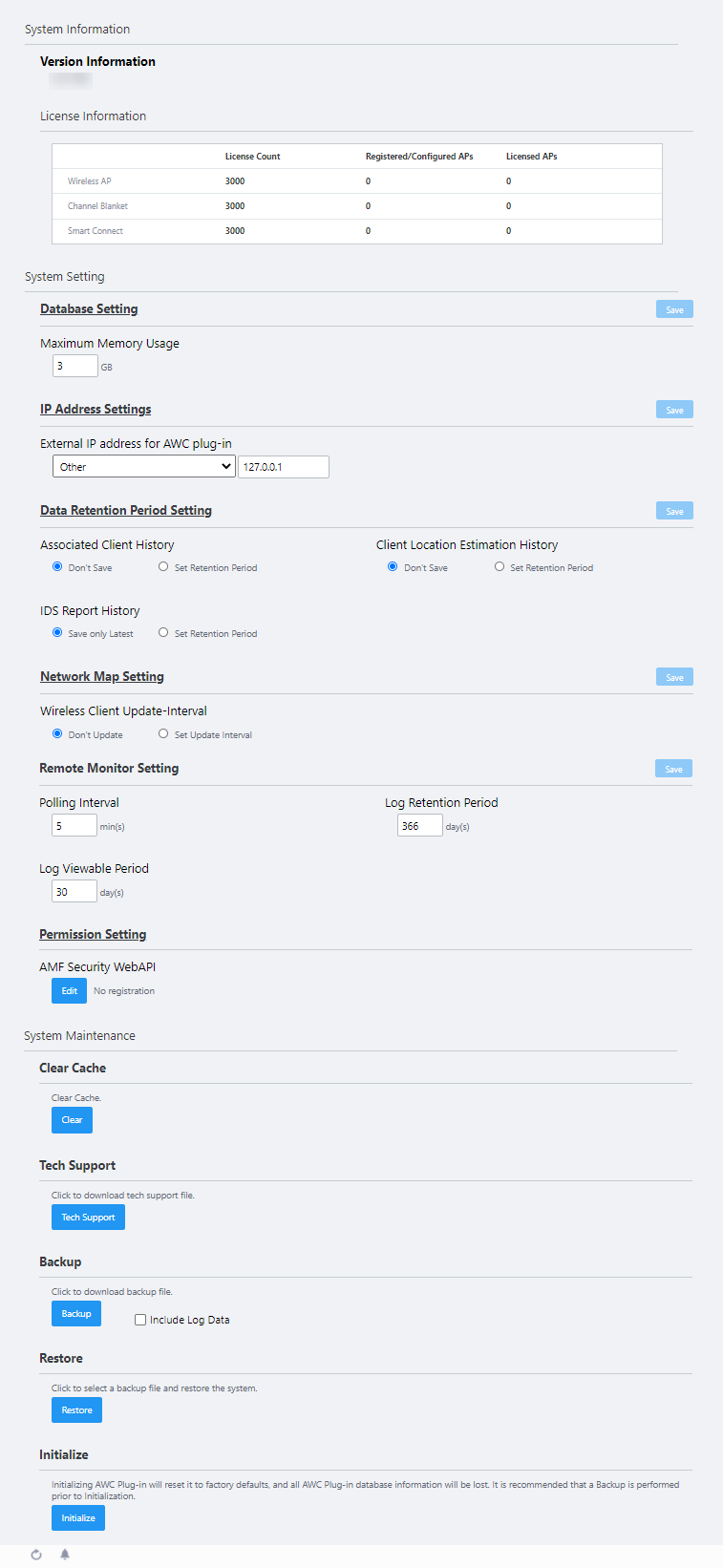The System Setting page lets you see the AWC Plug-in version, factory-reset the plug-in, and configure system settings.