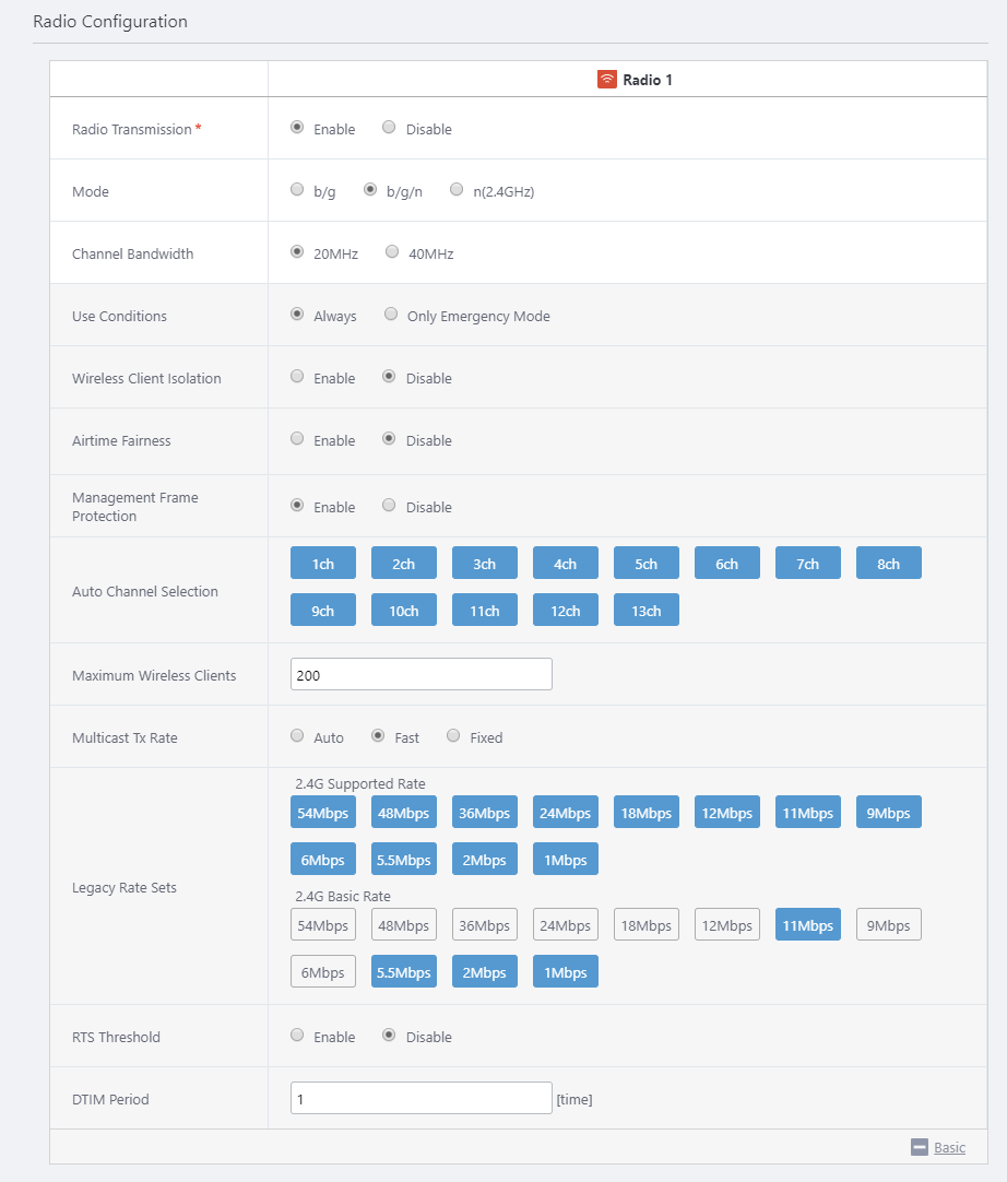 Refer to Enable Emergency Mode for more details.Wireless Client Isolation Disable Disable Specify whether to block communication between wireless clients connected to the same VAP. Airtime Fairness Disable Disable Specify whether to give each client an equal amount of airtime regardless of its speed. Management Frame Protection Enable Enable Specify whether to protect management frames. Auto Channel Selection All All Specify the channels to use. All channels are selected by default. Maximum Wireless Clients 200 200 Specify the maximum number of clients that can connect to the APs. Multicast Tx Rate Fast Fast Specify a selection method for IEEE 802.3 multicast/broadcast transmission rate. Legacy Rate Sets