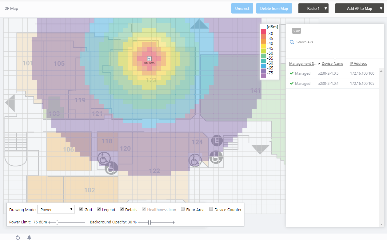 The heatmap calculates the radio signal strength at a given point from an AP's transmit power and the distance between the AP and the point. Because it assumes that there are no obstacles and reflection between the AP and the point, the actual radio signal strength may differ from the heatmap's calculation.