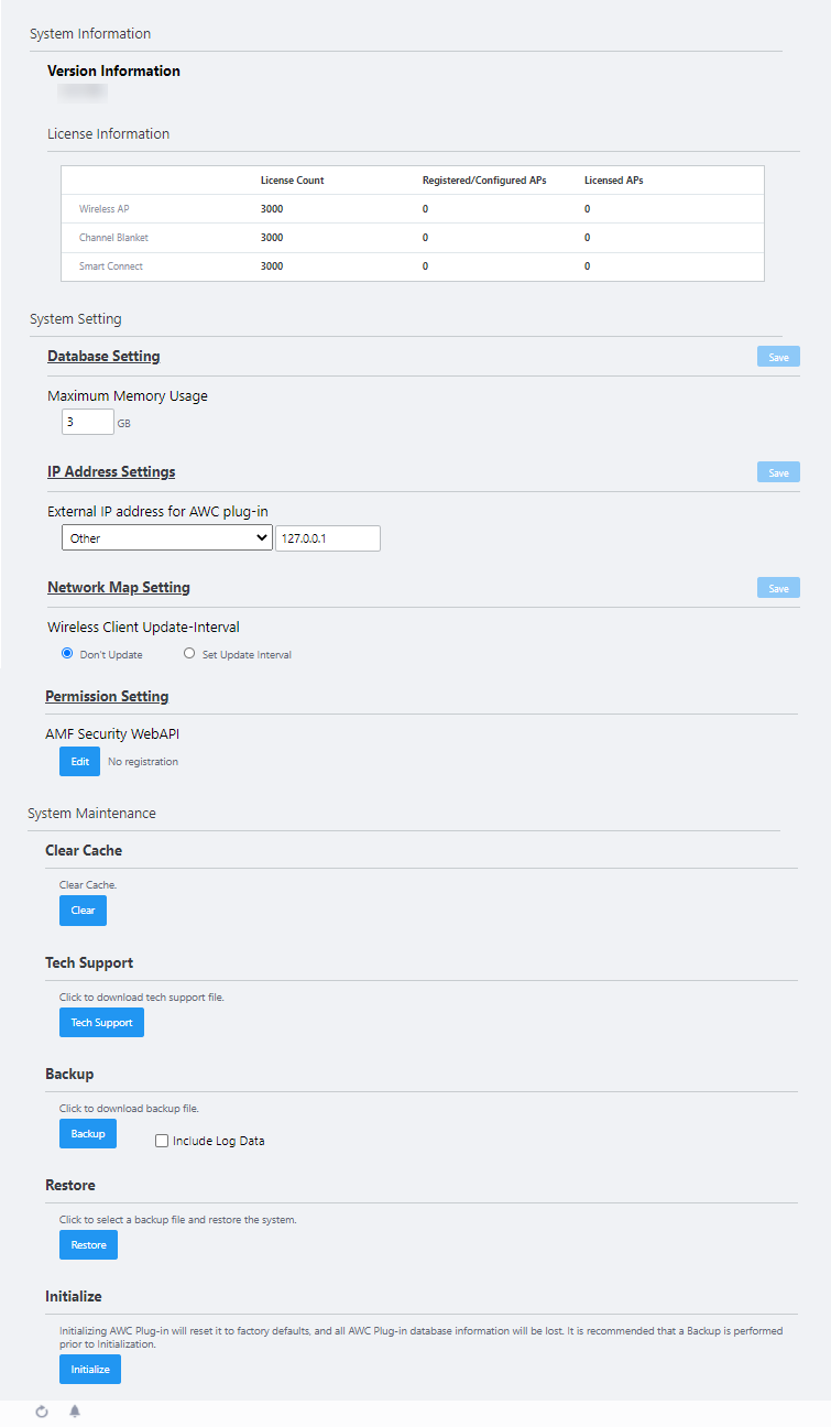 The System Setting page lets you see the AWC Plug-in version, factory-reset the plug-in, and configure system settings.