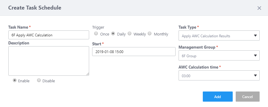Here we set "AWC Calculation Time" to "03:00". That means the AWC results calculated at 3 a.m. will be applied by the task scheduled at 3 p.m. every day.
