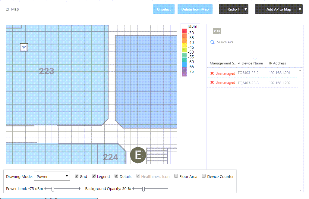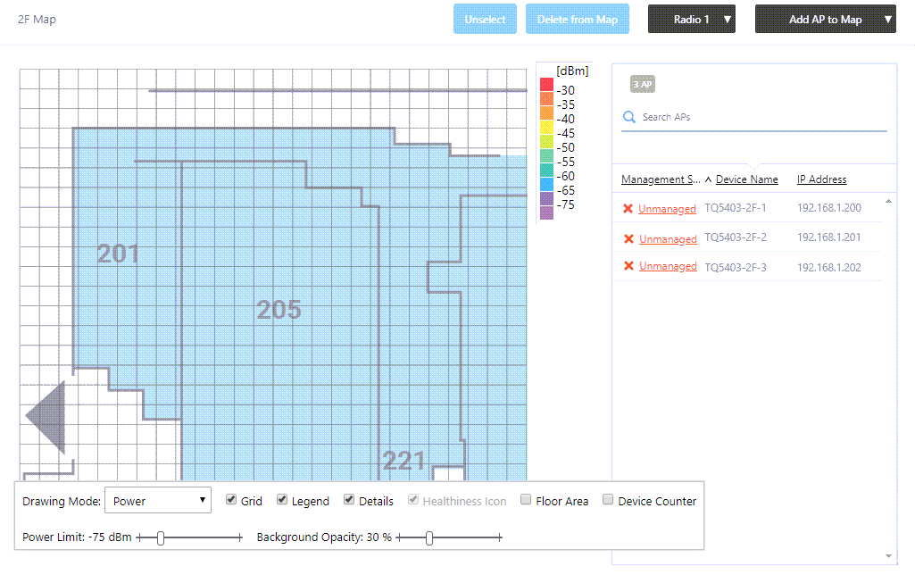 Select "Wireless Monitoring" > "Floor Map" from the AWC Plug-in menu, to display the "Floor Map" screen. You can see that the floor map "1F Map" has three APs placed on it.