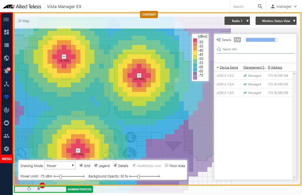 Menus in normal mode are the same as for Vista Manager EX. You can access the AWC plug-in functions through the "AWC Plug-in" menu on the Vista Manager EX main menu.When logged in as a user, "Wireless Monitoring", "Wireless Configuration" and "Device Search" menu items are available.