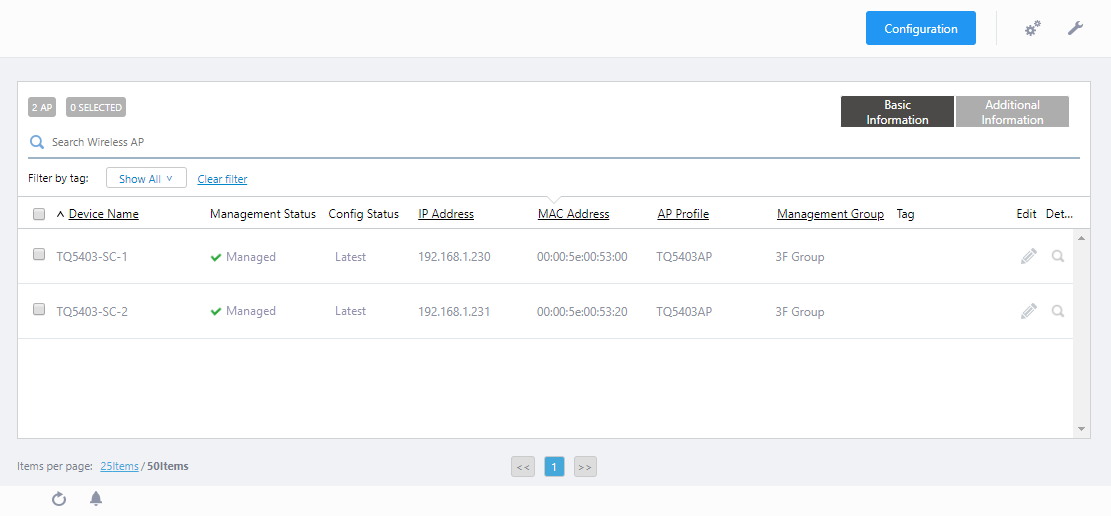 - When you are back at the AP list screen, you can see that the target APs' "Management Status" and "Configuration Status" have changed to "Waiting" and "Retrieving" respectively.