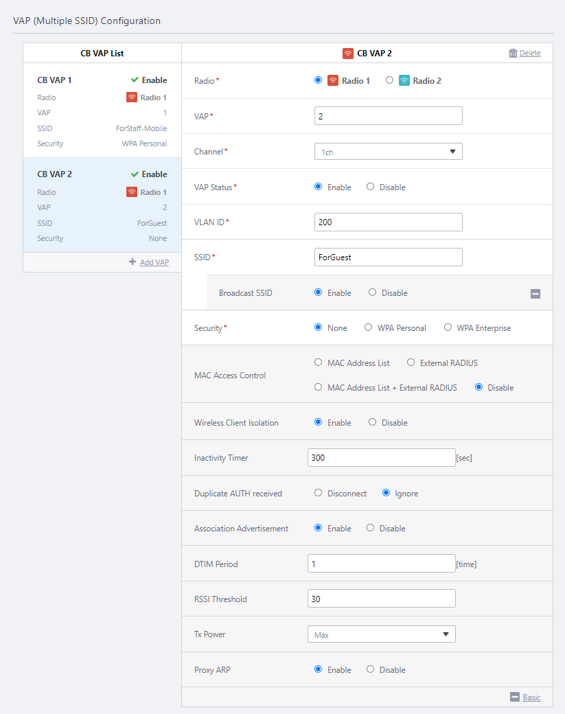 - Next, click "+ Add VAP" on "VAP (Multiple SSID) Configuration" to create another CB VAP for guests.