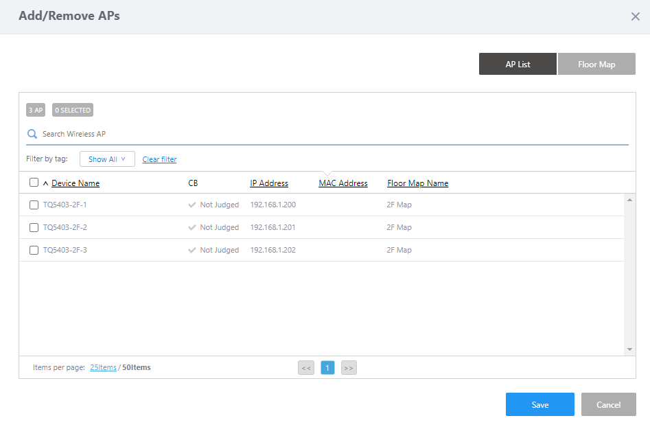 - Click "Save" in the "Add/Remove APs" dialog box to save the selection.