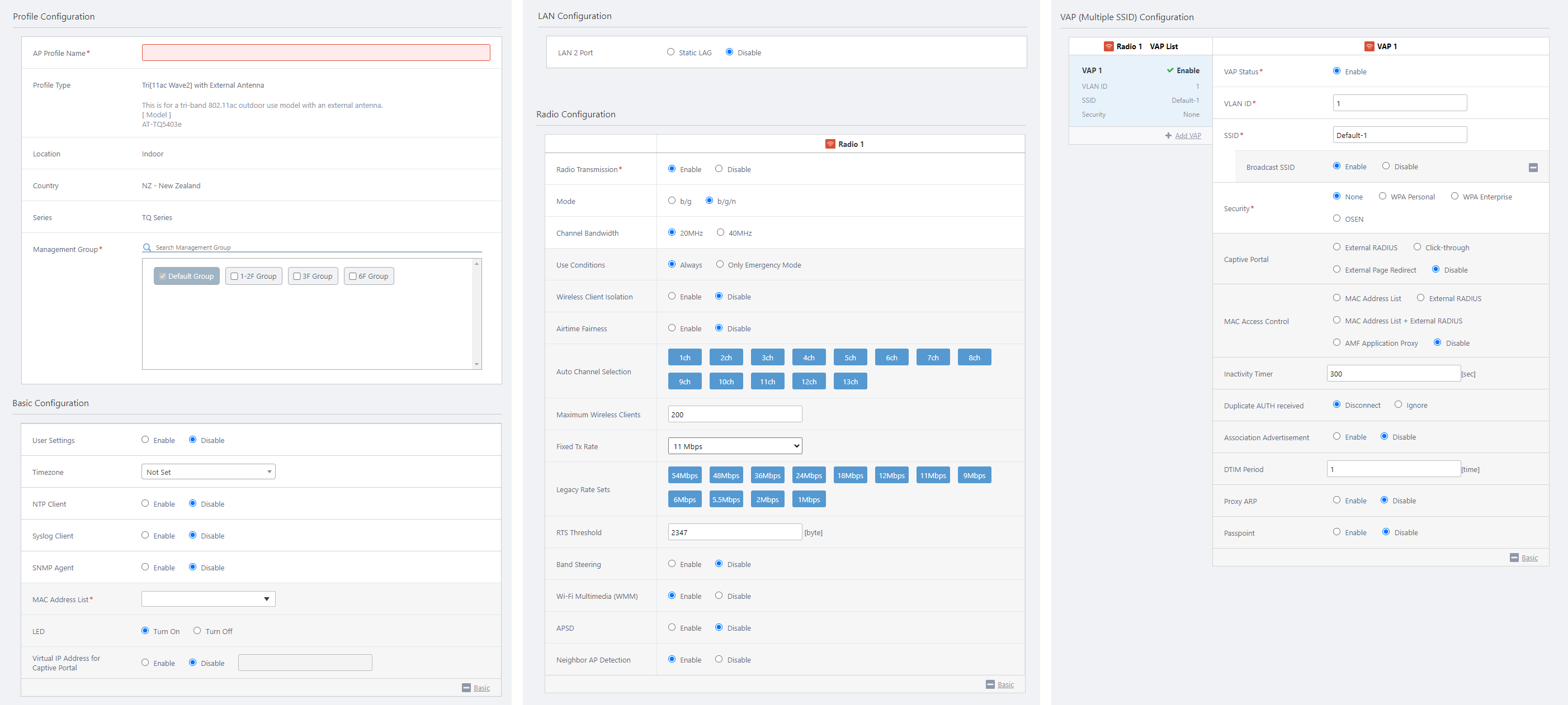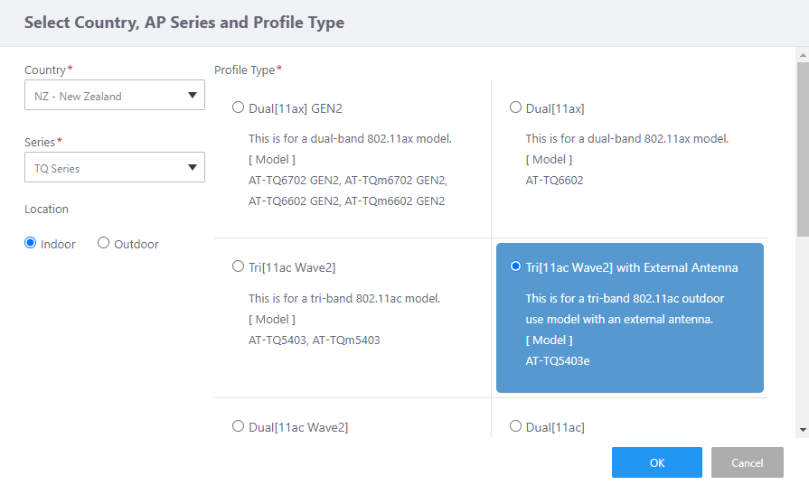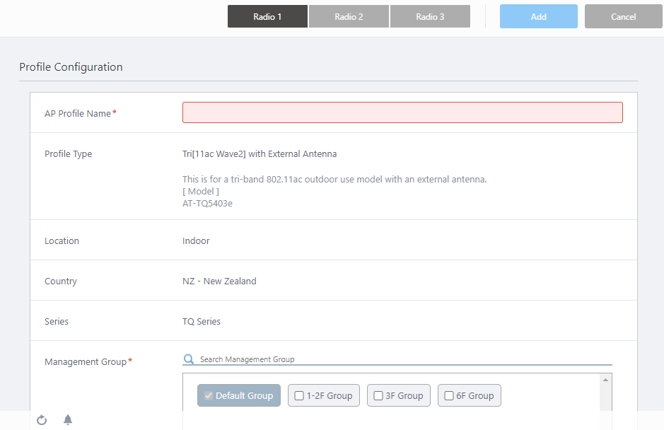 This item is displayed if you select "TQ Series" or "TQ Series - SDN/OpenFlow" for Series, and "Dual[11ax] GEN2", "Dual[11ax]", "Dual[11ac]", "Dual[11n]", "11ac With External Antenna" or "Single" for Profile Type.