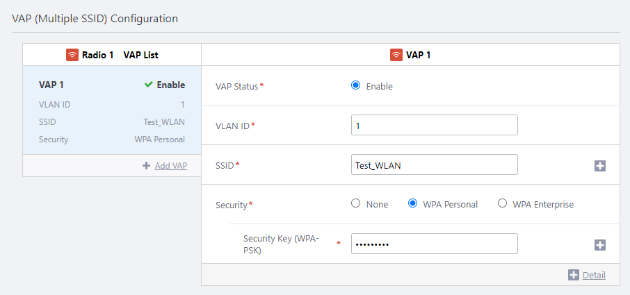 - In the "VAP (Multiple SSID) Configuration" section, click "+ Add VAP". Select Radio 1, Radio 2, or Radio 3 depending on the band you want to make public in case of an emergency.