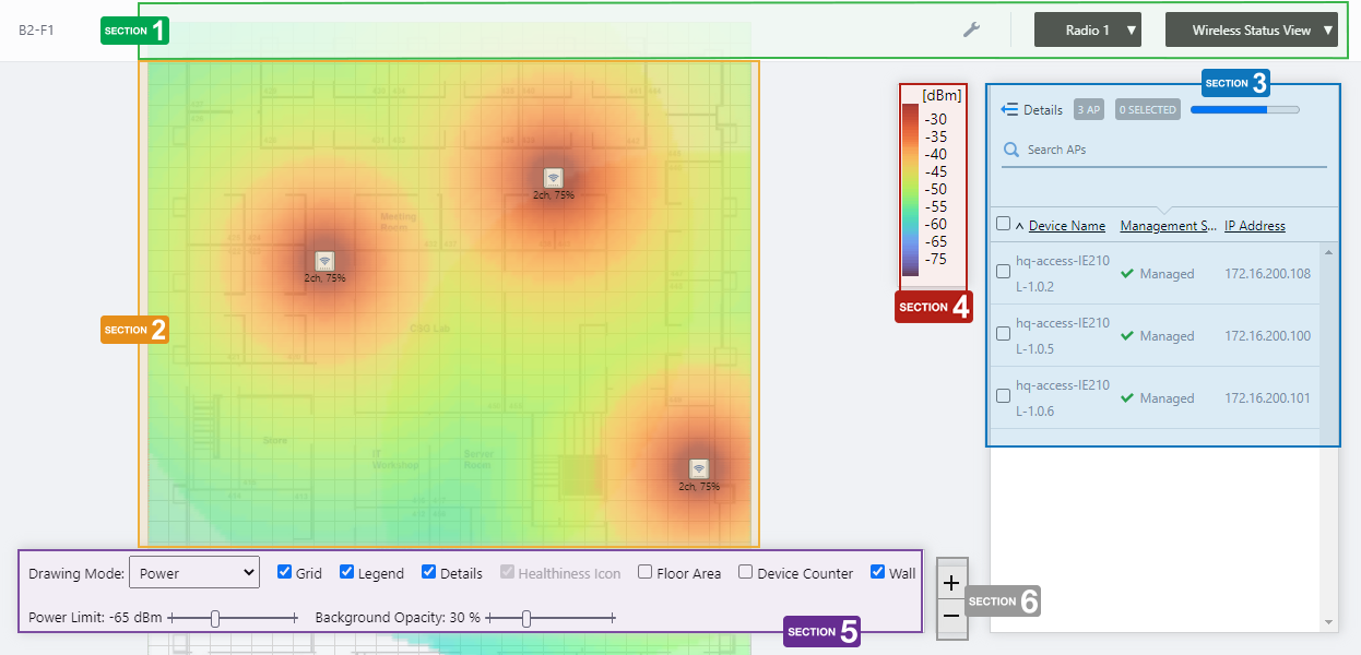 Each floor map displays the icons of the APs placed in the individual floor map detail screen, a heat map showing the channel or signal reach and strength in color around the wireless APs, and the areas or walls you have created.