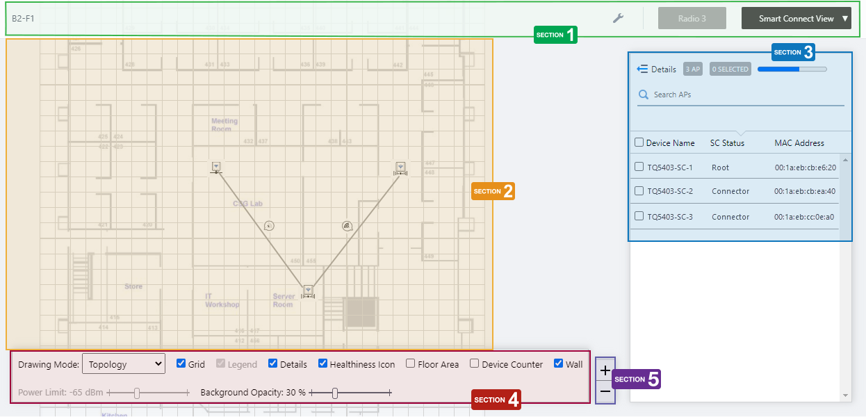 | Drawing Mode | The options in the Drawing Mode dropdown menu differ according to the immediately previous selection of the Views. If you chose Smart Connect View previously, the Drawing Mode dropdown comes with Topology and Traffic, and if you chose another view, the dropdown comes with Power and Channel. |