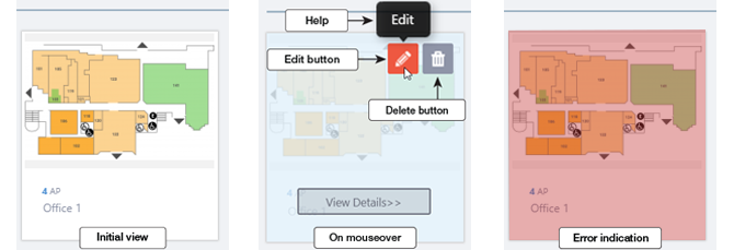 Each floor map is shown as a panel. The name of the floor map and the number of APs placed on the map are shown below the panel. When an Admin user hovers over a panel, that panel will become half-opaque, and "Edit" (pencil) and "Delete" (trashbin) buttons will appear at the top right of the panel Clicking the panel opens the "Floor Map Details" page for the floor map.