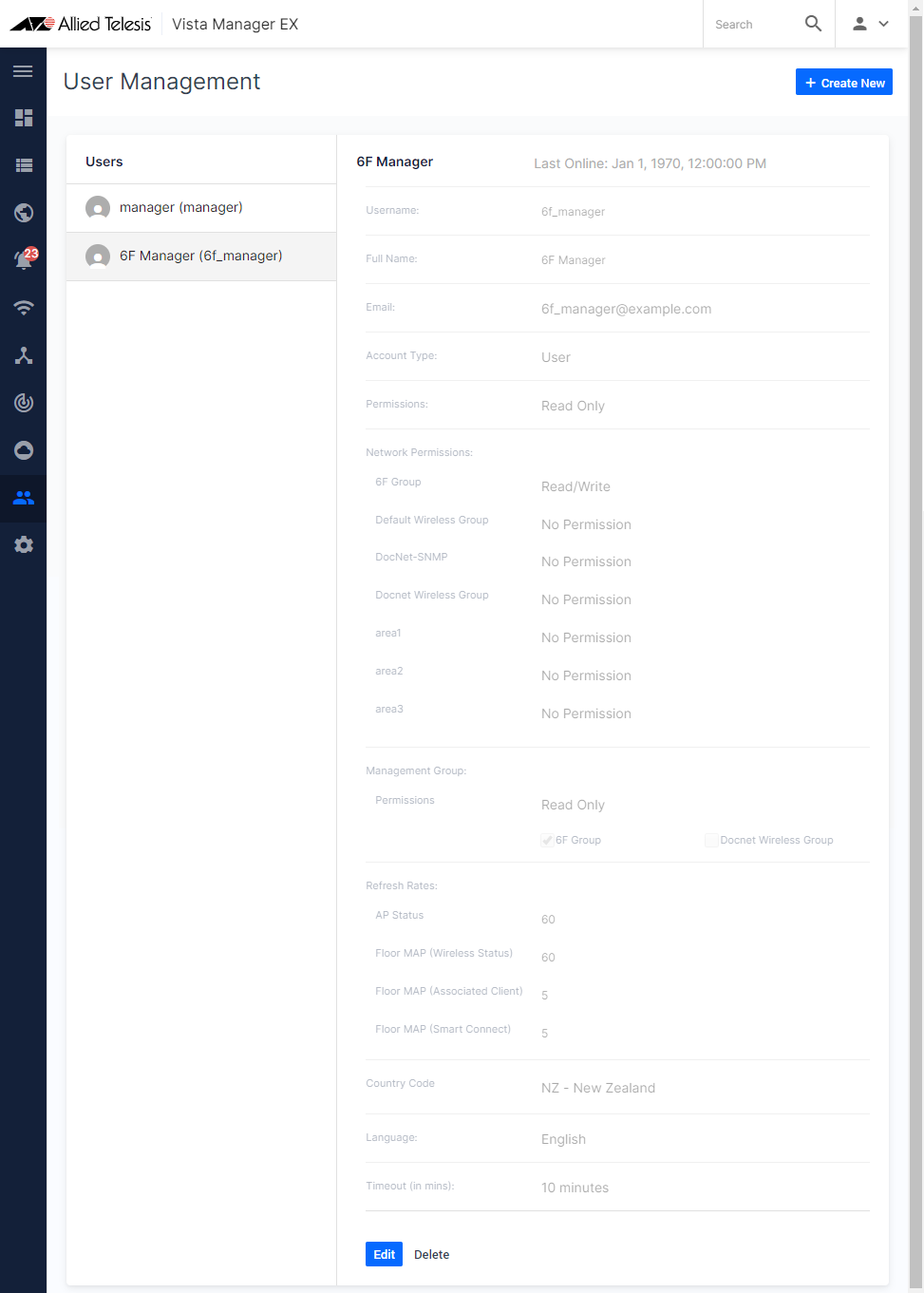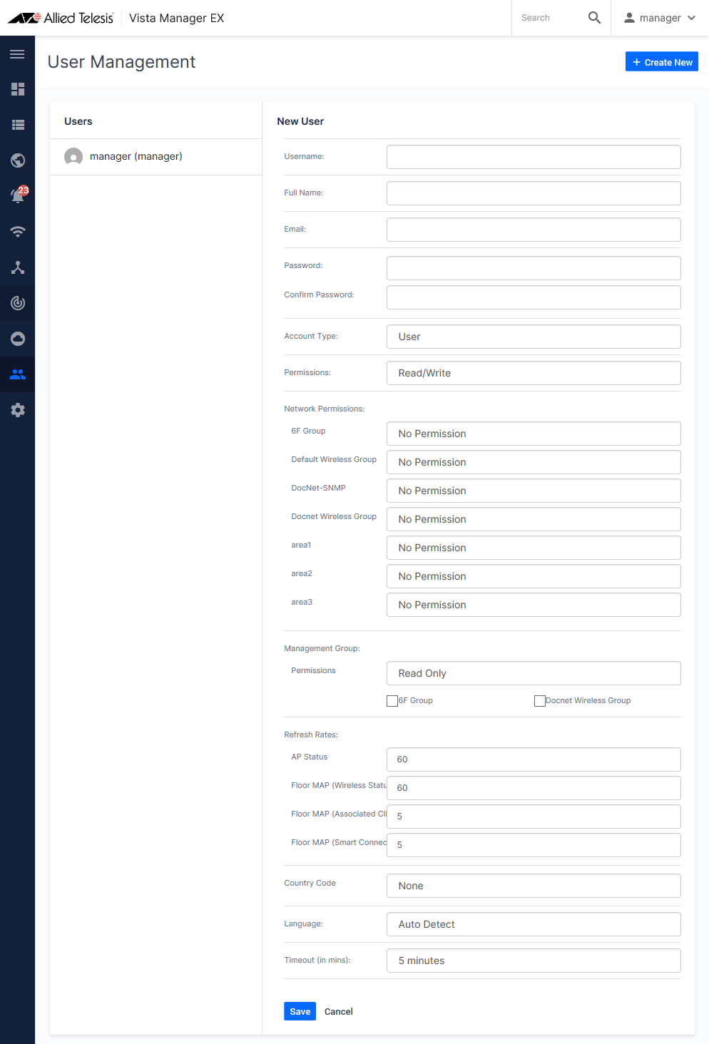 - If you specify "User" for the Account Type, select the user's permissions for Vista Manager EX Service Monitoring and the user's network access permissions for various "areas" (AMF areas, the AWC Plug-in's Management Group and the SNMP Plug-in's Subnet).