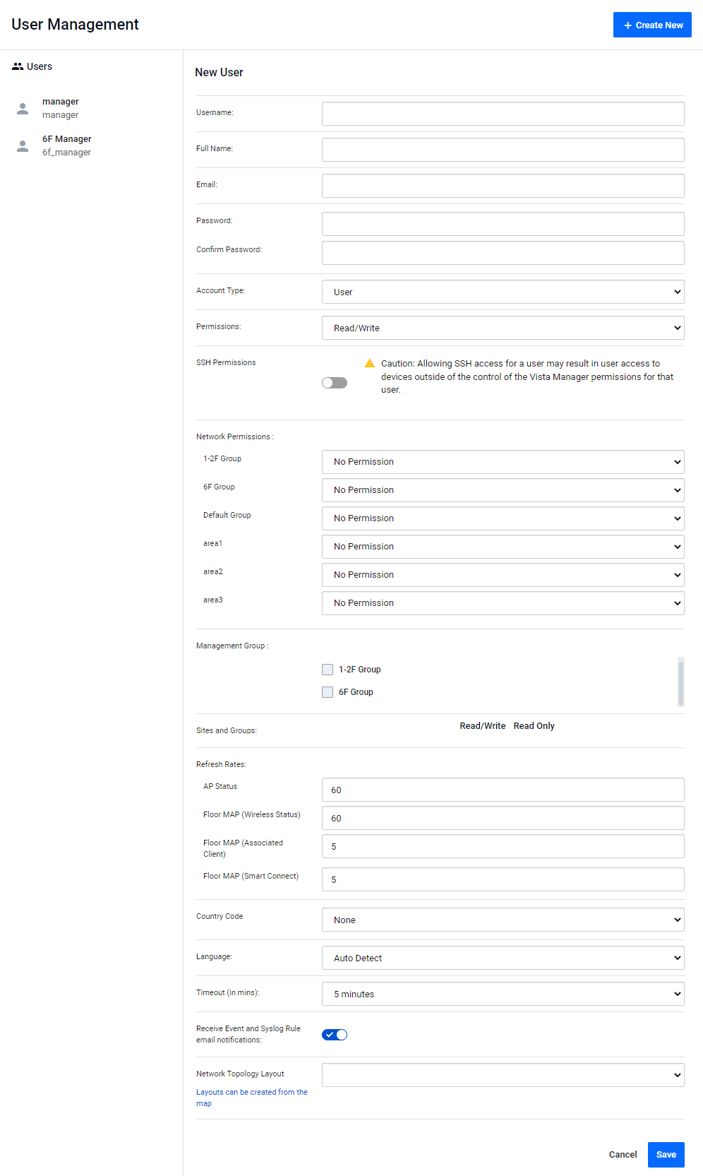 This option is not displayed when the account type is set to "Admin". You can edit all management groups and manage the floor maps, associated APs, and profiles they belong to.