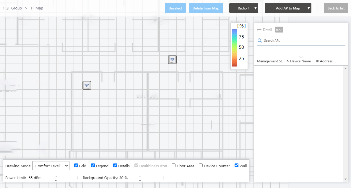 Select "Wireless Monitoring" > "Floor Map" from the AWC Plug-in menu, to display the "Floor Map" screen. You can see that the floor map "1F Map" has three APs placed on it.