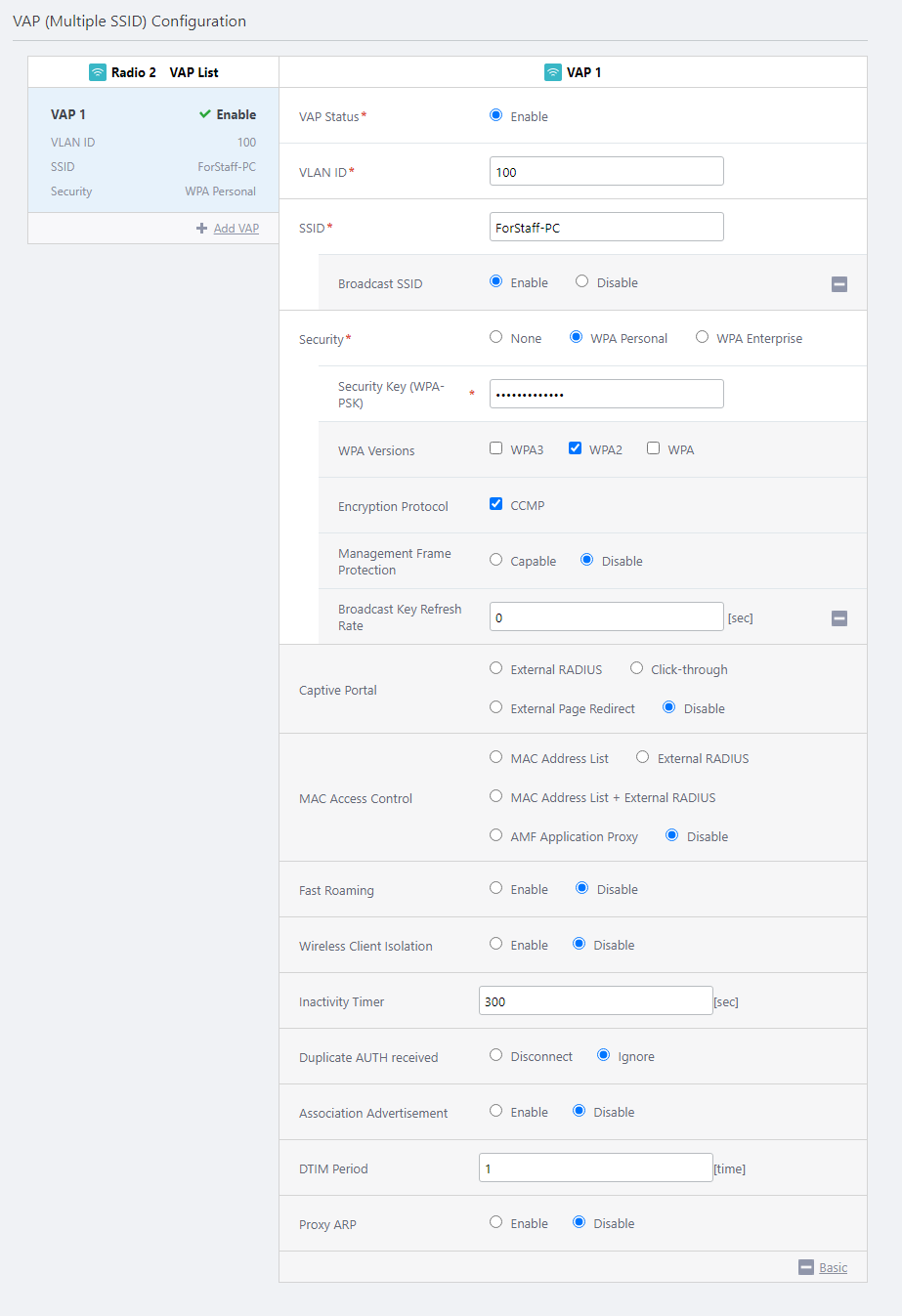 SSID ForStaff-PC Specify an SSID (network name) to use on the VAP. Broadcast SSID Enable Specify whether to broadcast the SSID on the VAP. Security WPA Personal Specify a security method for the VAP. Security Key (WPA-PSK) 5+@f/=0N1y Specify an encryption key for the VAP. WPA versions WPA2 Specify a WPA version to use on the VAP. Encryption Protocol CCMP Specify an encryption protocol to use on the VAP. Management Frame Protection Disable Specify whether to protect management frames from eavesdropping and forging. Broadcast Key Refresh Rate 0 Specify an interval at which to refresh the broadcast key that is sent to clients on the VAP. Specifying "0" stops the key from refreshing. Captive Portal Disable Specify whether to use the Captive Portal feature on the VAP. MAC Access Control Disable Specify whether to use MAC Access Control on the VAP. Fast Roaming Disable Specify whether to use Fast Roaming of wireless clients. Wireless Client Isolation Disable Specify whether to block communication between wireless clients connected to the same VAP. Inactivity Timer 300 Specify the delay before disconnecting a client that disappears without notifying the APs. Duplicate AUTH received Ignore Select how to process connection requests from clients that have maintained a connection. Association Advertisement Enable Specify whether to use Association Advertisement. DTIM Period 1 Specify how frequently to insert a DTIM (Delivery Traffic Indication Map) in the AP's beacons (every 1 to 255 beacons). Proxy ARP Disable Specify whether to use Proxy ARP.