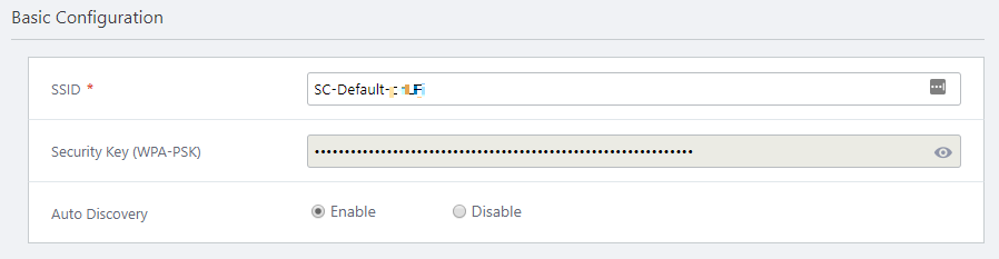 Since this SSID is not broadcast and communicates only with APs that have the same SC profile applied, there is usually no need to change from the default.Security Key (WPA-PSK) The encryption key is automatically set with 63 random alphanumeric characters. This cannot be changed. Auto Discovery Specify whether to automatically recognize beacons from new APs with "Enable" or "Disable".