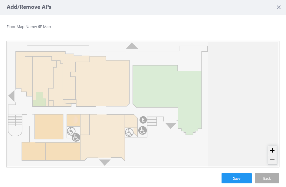 Save Saves the member AP information. Back Goes back to the "Floor Map List" page without saving the member AP information. - When you hover over an AP, its IP address, MAC address and model name will pop up.