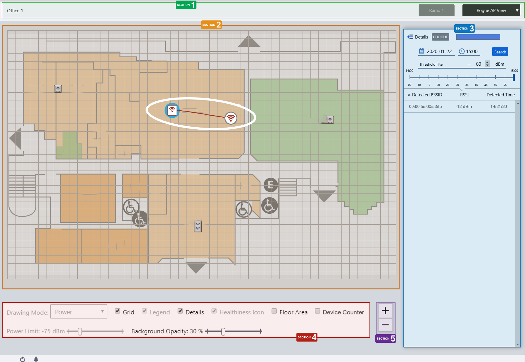 - When you click a rogue AP icon on the floor map, the corresponding entry in section 3 is highlighted.