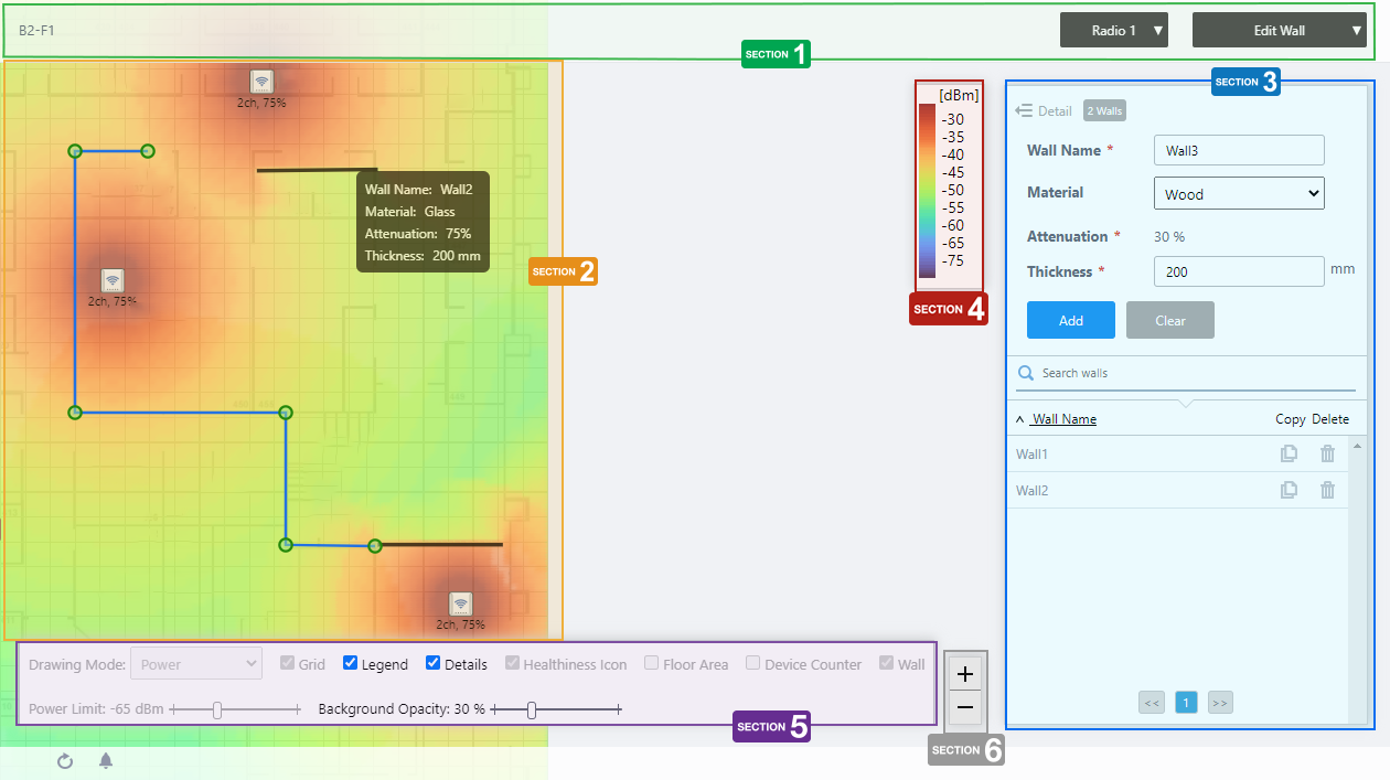 You can draw walls with polylines to simulate radio attenuation by walls, partitions, and pillars on the floor map.