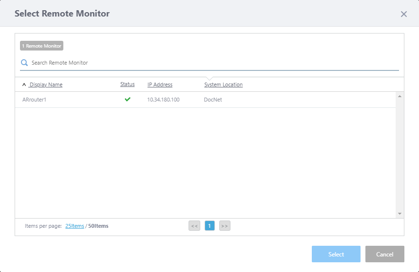 | Search Remote Monitor | Lets you filter the list of Remote Monitors. The search field lets you enter a partial string to match. The screend displays entries with that string in one of the following fields: "Display Name", "IP Address" or "System Location". To remove the filter, delete the string from the Search field and press Enter. NoteThe search is case-sensitive. |