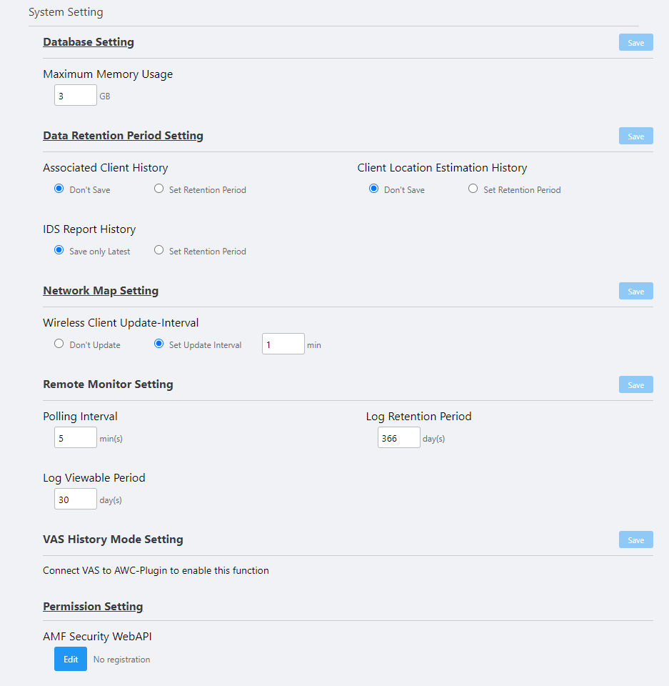 | Associated Client History | If VAS is configured, set the duration of the history of wireless client association and location information to be recorded in VAS.