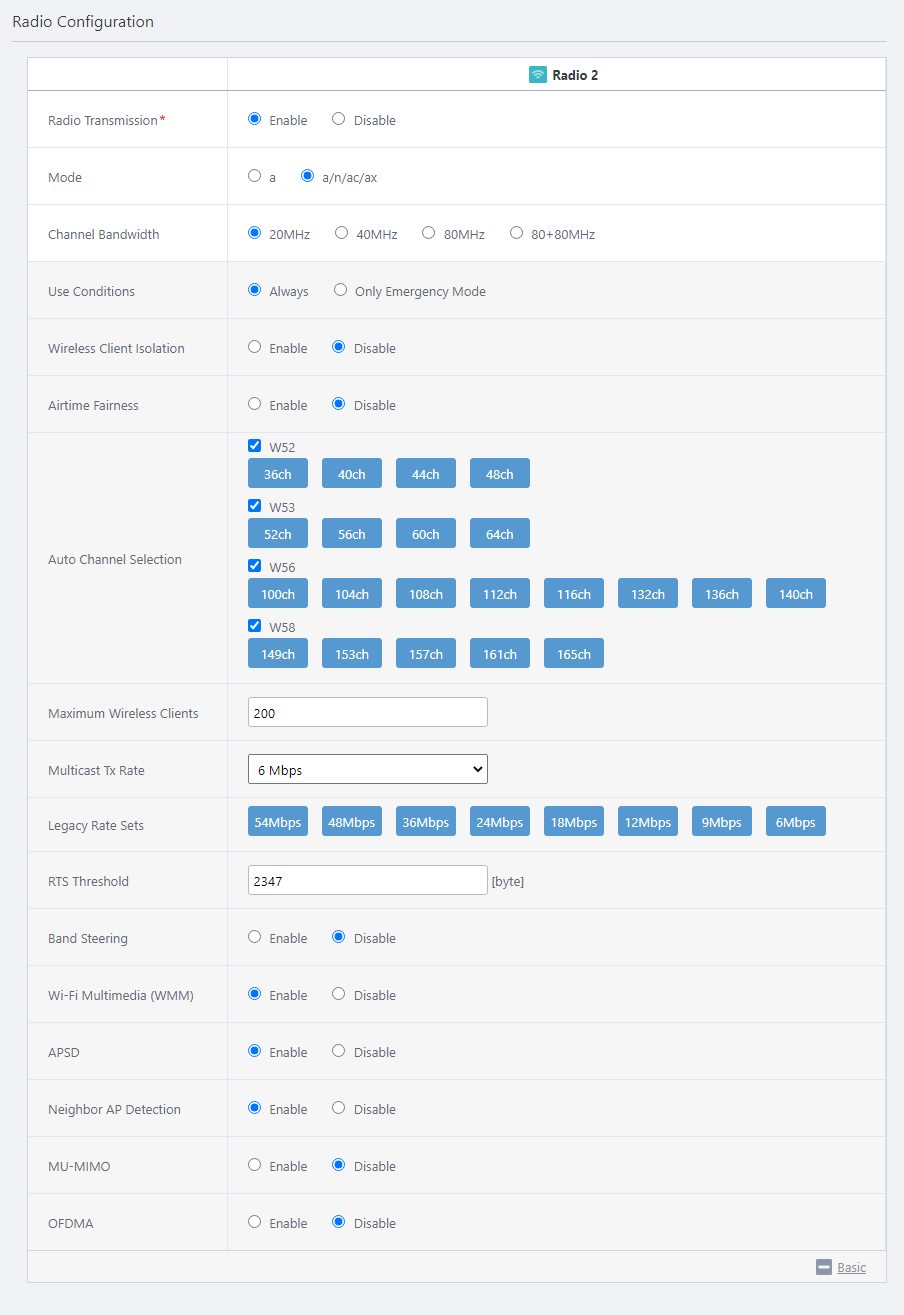 Refer to Enable Emergency Mode for more details.Wireless Client Isolation Disable Disable Specify whether to block communication between wireless clients connected to the same VAP. Airtime Fairness Disable Disable Specify whether to give each client an equal amount of airtime regardless of its speed. Auto Channel Selection All All Specify the channels to use. All channels are selected by default. Maximum Wireless Clients 200 200 Specify the maximum number of clients that can connect to the APs. Multicast Tx Rate 11 Mbps 6 Mbps Specify a selection method for IEEE 802.3 multicast/broadcast rate. Legacy Rate Sets All All Specify valid rates to use when IEEE 802.11b/g or IEEE 802.11a is being used. RTS Threshold 2347 2347 To transmit RTS packets in IEEE 802.11b/g/a mode, select Enable and specify the minimum size of Tx packets. Band Steering Disable Disable Specify whether to use the Band Steering feature, which encourages clients supporting both 2.4GHz and 5GHz to prefer 5GHz in order to reduce congestion in 2.4GHz.