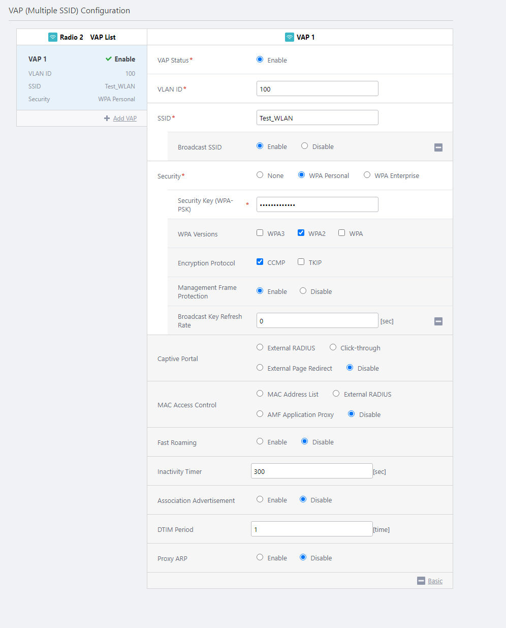 SSID Test_WLAN Test_WLAN Specify an SSID (network name) to use on the VAP. Broadcast SSID Enable Enable Specify whether to broadcast the SSID on the VAP. Security WPA Personal WPA Personal Specify a security method for the VAP. Security Key (WPA-PSK) CoNFiDeNTiaL CoNFiDeNTiaL Specify an encryption key for the VAP. WPA versions WPA2 WPA2 Specify a WPA version to use on the VAP. Encryption Protocol CCMP CCMP Specify an encryption protocol to use on the VAP. Management Frame Protection Enable Enable Specify whether to protect management frames from eavesdropping and forging. Broadcast Key Refresh Rate 0 0 Specify an interval at which to refresh the broadcast key that is sent to clients on the VAP. Specifying "0" stops the key from refreshing. Captive Portal Disable Disable Specify whether to use the Captive Portal feature on the VAP. MAC Access Control Disable Disable Specify whether to use MAC Access Control on the VAP. Fast Roaming Disable Disable Specify whether to use Fast Roaming of wireless clients. Inactivity Timer 300 300 Specify the delay before disconnecting a client that disappears without notifying the APs. Association Advertisement Disable Disable Specify whether to use Association Advertisement. DTIM Period 1 1 Specify how frequently to insert a DTIM (Delivery Traffic Indication Map) in the AP's beacons (every 1 to 255 beacons). Proxy ARP Disable Disable Specify whether to use Proxy ARP.