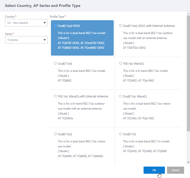 The "Select Country, AP Series and Profile Type" dialog box will appear.