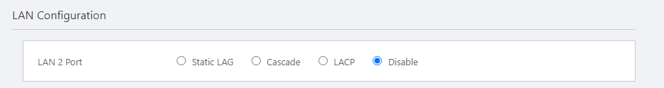 In this example, we will not be using link aggregation or cascading features. Please make sure that Disable is selected.Table 3: TQ6702 GEN2 LAN Configuration Item Name Value Description LAN 2 Port Disable Specifies TQ6702 GEN2 and TQm6702 GEN2's LAN1/PoE and LAN2 ports behavior, such as link aggregation or cascading.