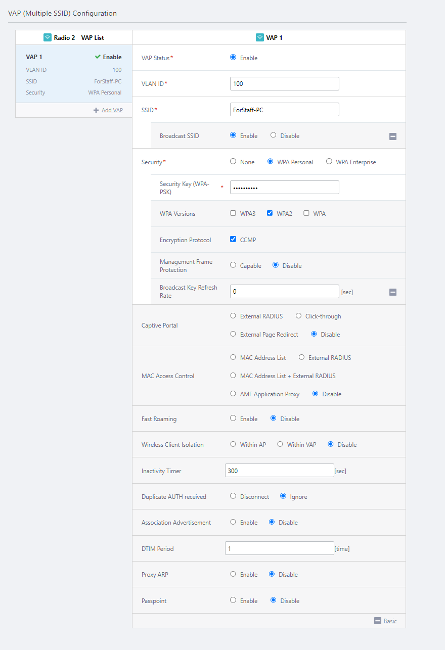 SSID ForStaff-PC Specify an SSID (network name) to use on the VAP. Broadcast SSID Enable Specify whether to broadcast the SSID on the VAP. Security WPA Personal Specify a security method for the VAP. Security Key (WPA-PSK) 5+@f/=0N1y Specify an encryption key for the VAP. WPA versions WPA2 Specify a WPA version to use on the VAP. Encryption Protocol CCMP Specify an encryption protocol to use on the VAP. Management Frame Protection Disable Specify whether to protect management frames from eavesdropping and forging. Broadcast Key Refresh Rate 0 Specify an interval at which to refresh the broadcast key that is sent to clients on the VAP. Specifying "0" stops the key from refreshing. Captive Portal Disable Specify whether to use the Captive Portal feature on the VAP. MAC Access Control Disable Specify whether to use MAC Access Control on the VAP. Fast Roaming Disable Specify whether to use Fast Roaming of wireless clients. Wireless Client Isolation Disable Specify whether to block communication between wireless clients connected to the same VAP.